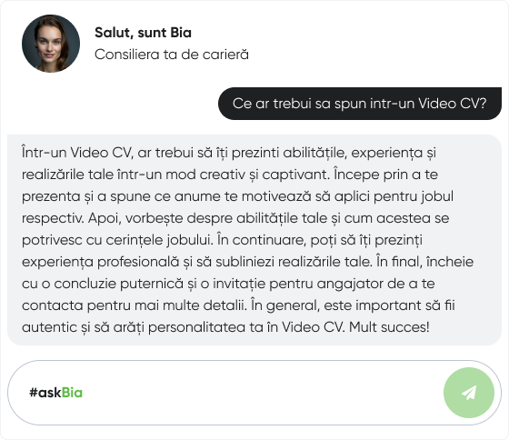 Te consulți cu Bia dacă mai ai întrebări despre ce să conțină video CV-ul tău.
